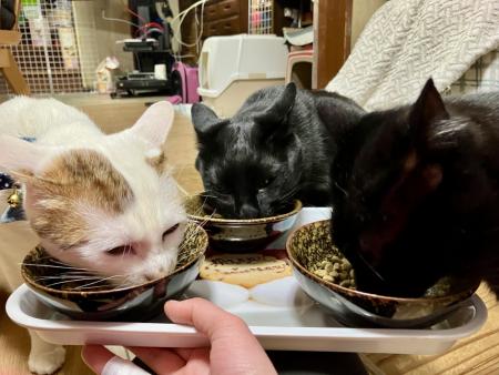 左からフィガロ、トン君、カンくん。 ご飯の用意中はとにかくモテます。 みんな基本いい子で待ってるけど、 フィガロくんだけは大騒ぎ。 家族にはよく「うるさい」って言われるけど、 本人の性格だからしょうがないよねぇ。 でも、いざご飯を出すと 3匹そろって無言で夢中。 さっきまでの賑やかさが嘘みたいです。 特にトン君は早食いなので、ちゃんと見てないとよこどりします。 かれらにだいじなのは「いま」。 自分たちが食べ終わっても、 袋のかさかさ音=おれのもん。 必ず営業をかけてきます。 それが人間用のだろうと関係ありません。 しかも可愛く、胴体をたてにのばして 人間の膝におててをのっけてアピール。 それに負けて、おやつをあげる人間。 完全に猫の思う壺。 はたから見ると、猫の奴隷。 デブになる・(モノによっては)尿路結石になるからやめとけと思うものの、 いざやられると、ほだされるよね。