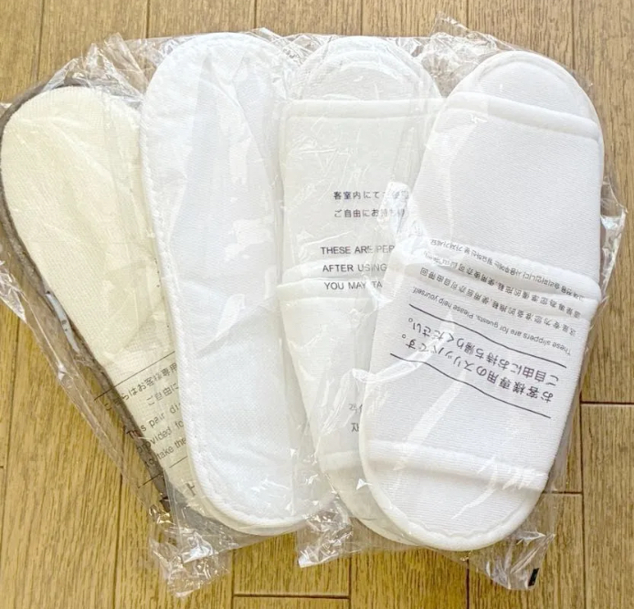 ホテルの客室に置いてある、あの白いタイプ。 ヤフーフリマで安く入手してて、もう何回リピしたか分からないくらい。 来客用にもサッと出せるし、 「誰が履いたかわからないスリッパはちょっと…」って人でも安心^^ 衛生的で、古くなったら気軽にポイして新しいのに替えられるのも楽。 しかも意外と、こういうのって人にあげても嫌がられない。 むしろ喜ばれることもあるかもね☆*:.。. o(≧▽≦)o .。.:*☆